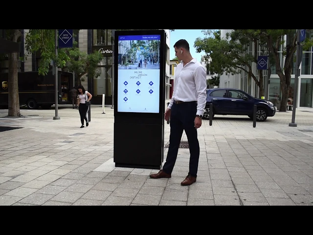 To keep visitors informed about the district’s many shops, restaurants, events, and museums, Miami Design District partnered with RoveIQ to deploy interactive digital directories. Dual-sided 55" touchscreen kiosks provide 3D wayfinding to local places of interest, highlight event schedules, advertising, and feature works of local artists.