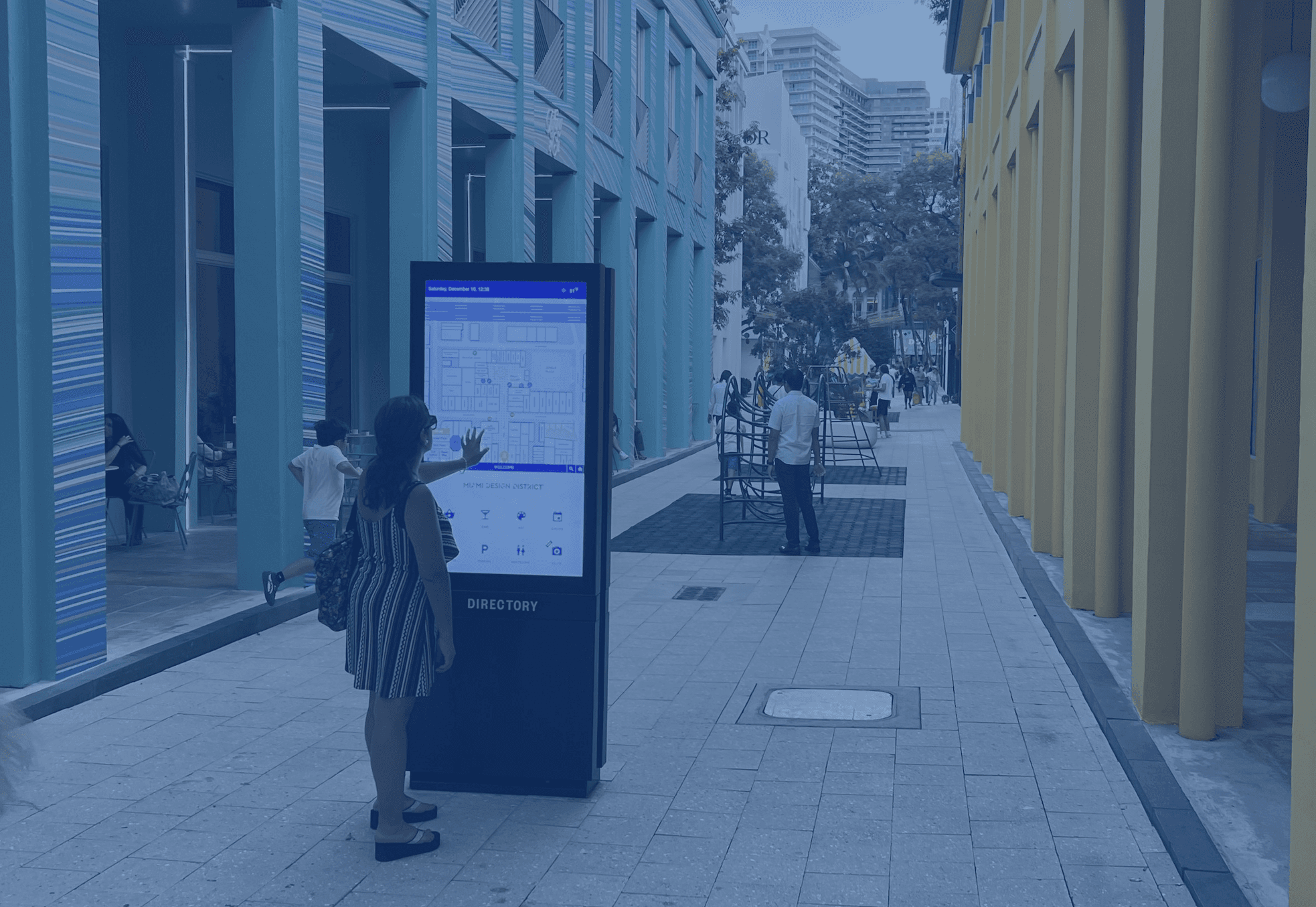The digital directory display helps with finding tenants listings, searching, mapping the area, navigating, and promoting ads. This is important for many types of spaces. These spaces include shopping centers, mixed-use developments, arenas, cities, hospitals, and universities. It applies to both indoor and outdoor spaces.